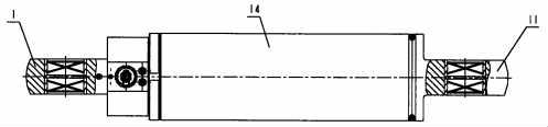 油路接頭6安裝于活塞桿5上,油路接頭6通過(guò)活塞桿5上的油路連至油缸活塞 10的兩端?;钊麠U5外套有缸體14,在活塞桿5與缸體14之間的一端裝有活塞10,在活塞桿5與缸體14之間的另一端由內(nèi)到外依次安裝壓蓋7和端蓋8,壓蓋7位于端蓋8內(nèi)側(cè),壓蓋7與端蓋8通過(guò)螺栓連接。
