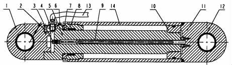 圖中,l前端耳環(huán);2錐銷(xiāo);3磁致伸縮位移傳感器;4線(xiàn)接頭;5活塞桿;6油路接頭;7壓蓋; 8端蓋;9磁環(huán)支撐架;10活塞;11缸底耳環(huán);12襯套;13液壓膠管;14缸體。